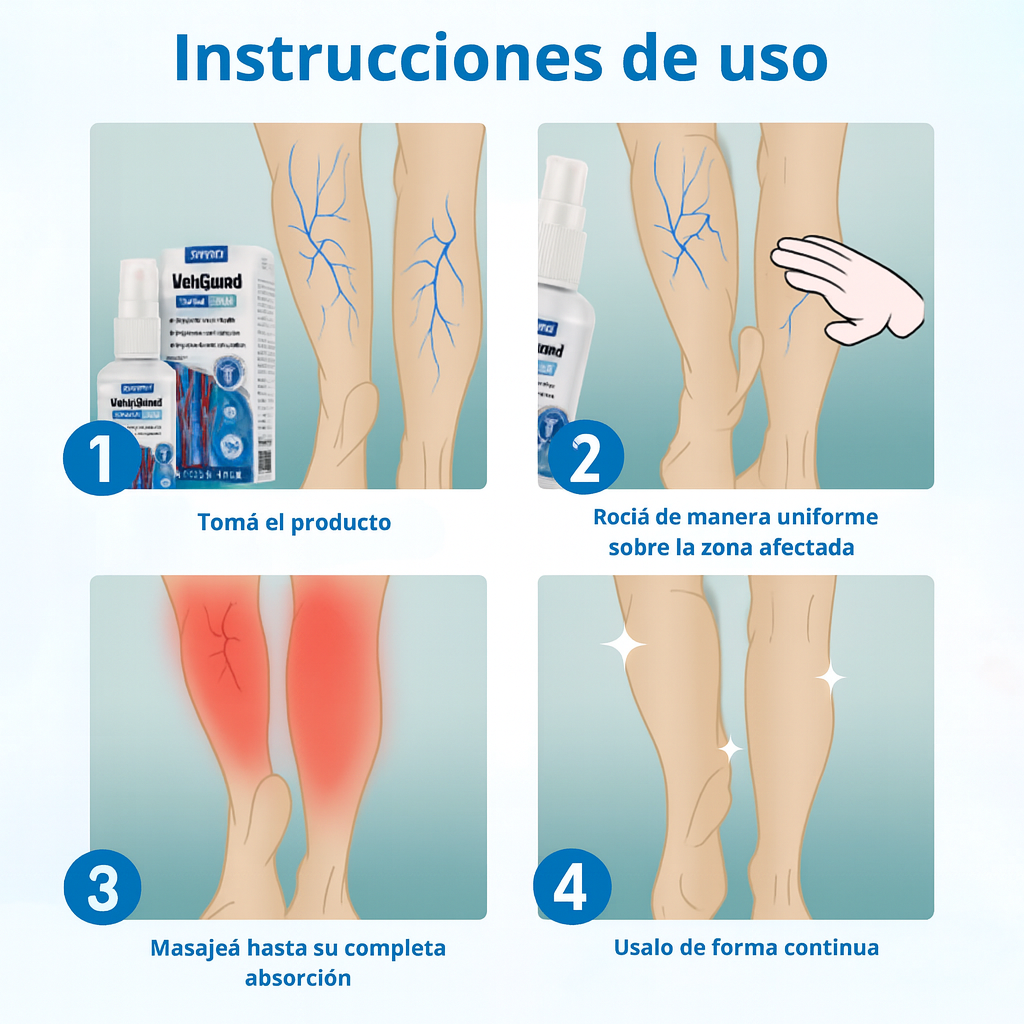 VEINGUARD Herbal Spray actúa de forma inmediata, refrescando y calmando la piel mientras ayuda a reducir la inflamación y mejorar el flujo sanguíneo. Ideal para quienes pasan muchas horas de pie o sentados.
